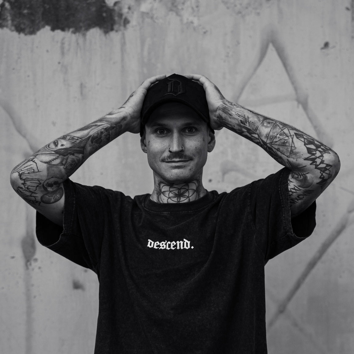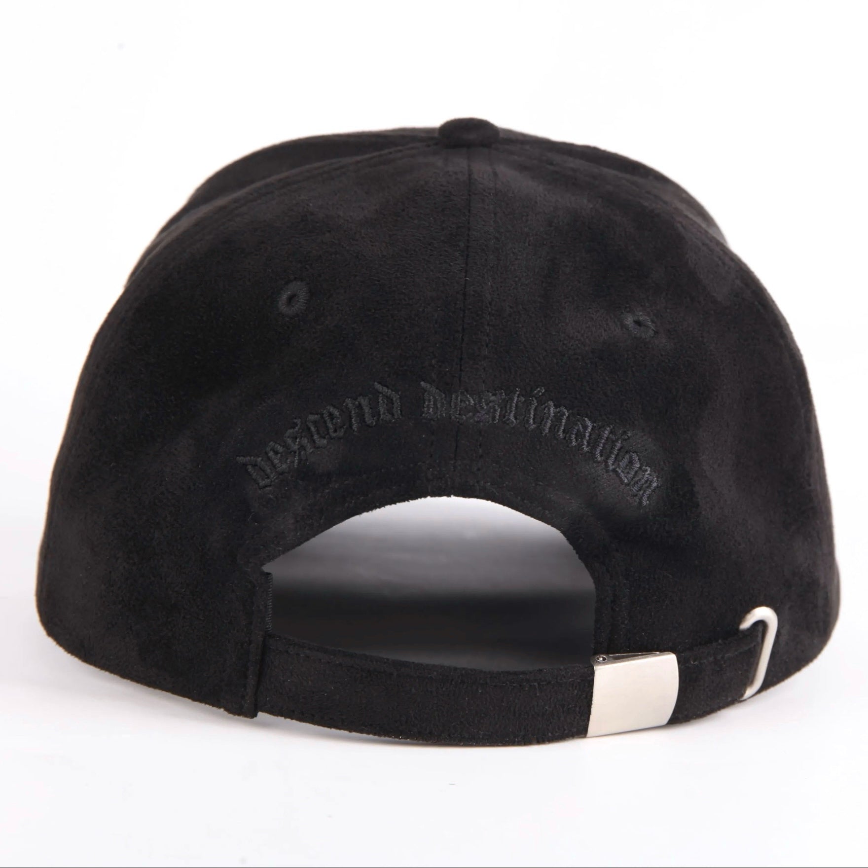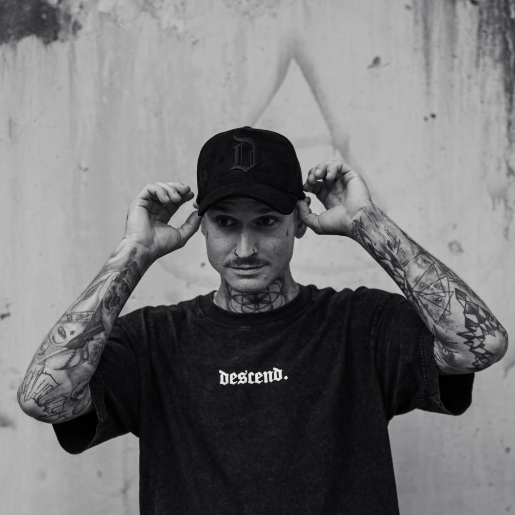 Vorne ein dezentes „d“ im Retro-Stil, hinten ein gebogener „descend destination“-Schriftzug – Ton in Ton gestickt, für den vollen Black-on-Black-Vibe.
